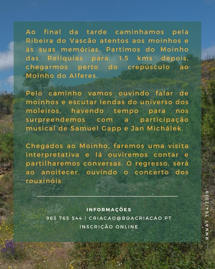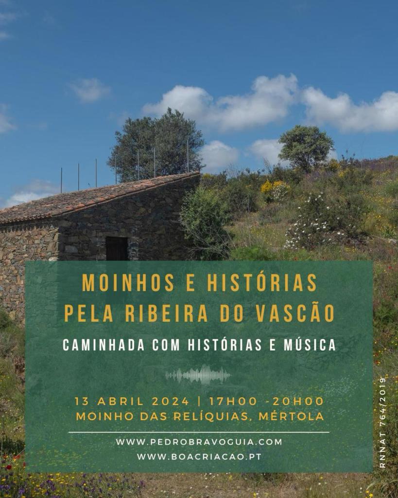 No dia 13 de abril de 2024, numa caminhada com histórias, música e surpresas sonoras, vários lugares ao longo da Ribeira do Vascão foram revisitados, entre eles dois moinhos antigos e as suas memórias. As lendas e histórias participativas, recolhidas previamente da cooperativa boa CRIAÇÃO em contacto com pessoas do Concelho, falavam sobre moinhos e moleiros, valorizando a tradição oral e criando uma ligação íntima entre o imaginário e a realidade.