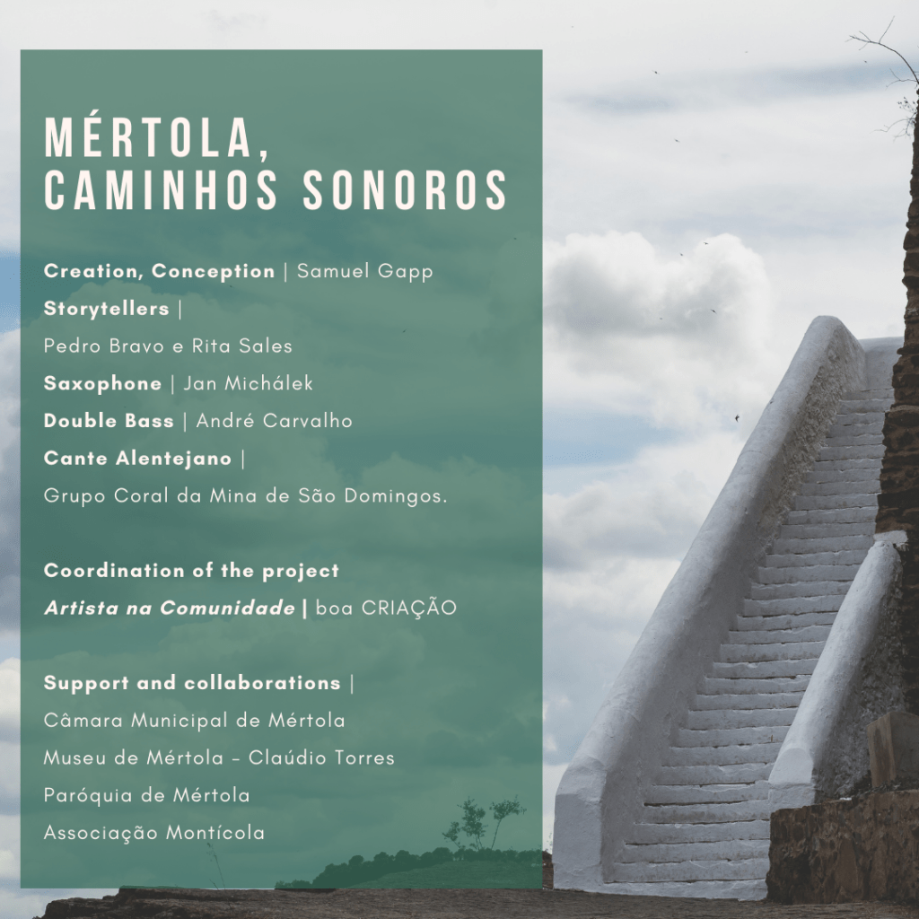 On 18 May 2024, as part of the International Museum Day celebrations, the event Mértola, Caminhos Sonoros (transl. Mértola, Sound Paths) took place – a musical and literary walk through the old part of the town of Mértola that culminated in a concert in the Main Church, involving two contemporary musicians from Lisbon and the choir group of Mina de São Domingos (committed to traditional singing, called Cante Alentejano). The event described the final moment of the residency, incorporating the work created to date and the multiple experiences with all their complexity and depth, trying to capture the essence of what was given to me by the Alentejo and the Alentejanos.
