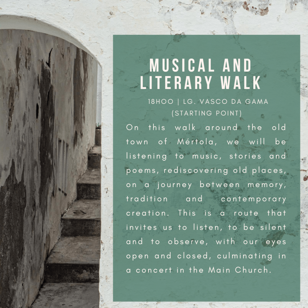 On this walk around the old town of Mértola, we will be listening to music, stories and poems, rediscovering old places, on a journey between memory, tradition and contemporary creation. This is a route that invites us to listen, to be silent and to observe, with our eyes open and closed, culminating in a concert in the Main Church.