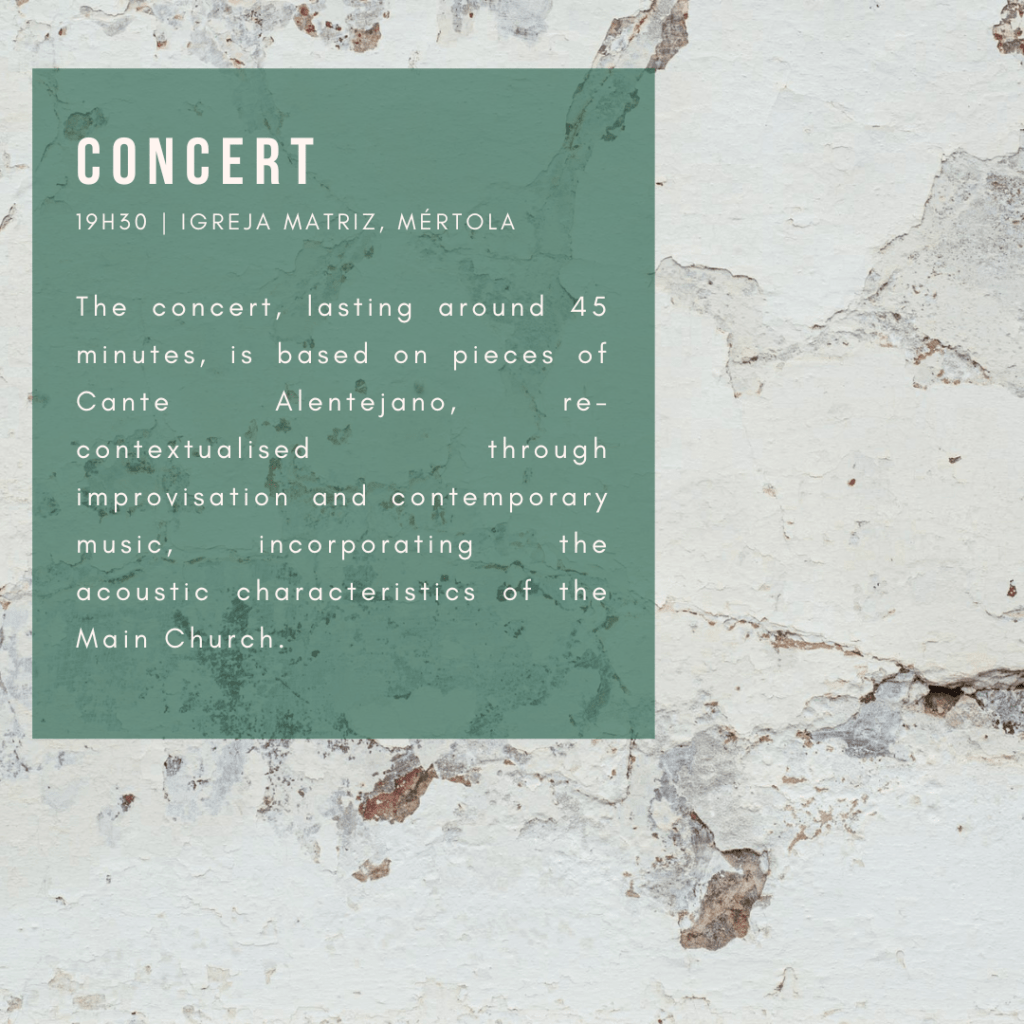 The concert, lasting around 45 minutes, is based on pieces of Cante Alentejano, re-contextualised through improvisation and contemporary music, incorporating the acoustic characteristics of the Main Church.